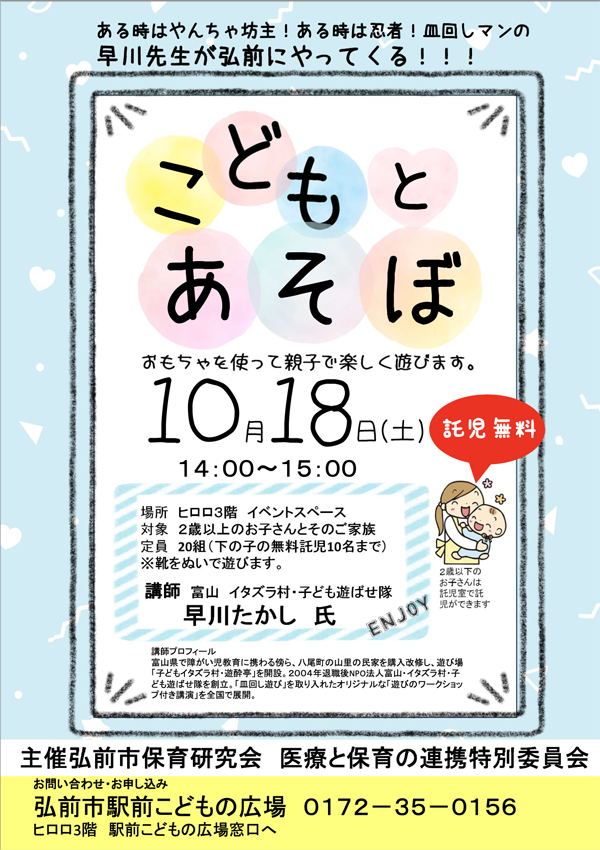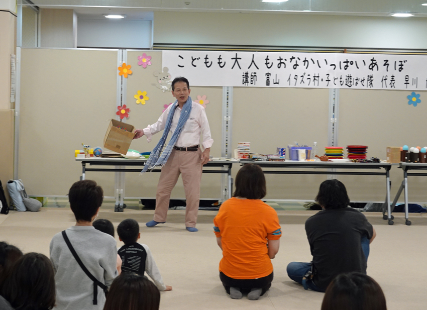 随分と涼しくなった10月中旬の土曜日、ヒロロ3階健康ホールでタイトルの催し物が開かれました。富山から早川たかし先生を呼んでの親子であそぶことをテーマにした企画です。「おなか いっぱい あそぼ」はヒロロのこども家庭センターの0さんが作ってくれた横断幕のタイトルでした。