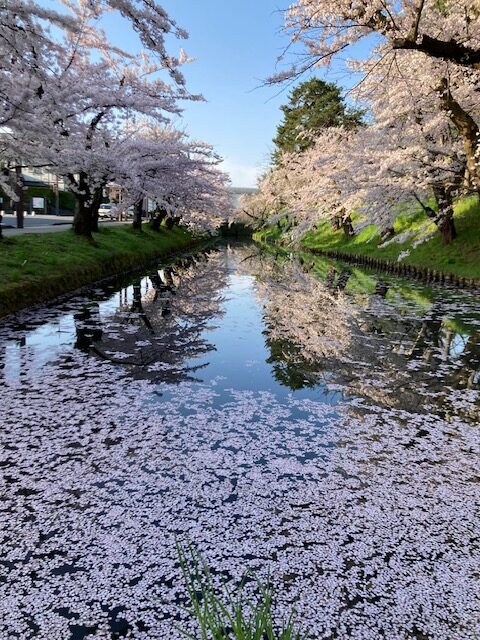 私は毎年、桜の咲き始めから花筏まで期間限定、早起きが楽しみになるこの時期だけ朝の散歩で桜を満喫しています。昨年知ったのですが、散歩をしていると散りはじめでもないのに、ポタポタ〜クルクル〜っと目の前に桜の花が降ってくる場所(特定の木)があります。しかも、枝の上をぴょんぴょん移動しながら落としてくる輩(小鳥)が数羽います。1日でも長くお花見散歩がしたいのに、花ごと落とすなんて!なんて鳥だ!!そう思っていました。よく見るとスズメ。鳴き声も楽しそうなチュンチュン。調べてみたら、桜の蜜が好物だそうで、花の根元をかじっておいしい蜜を楽しんでポトっと”ごちそうさま”をするようです。たくさんあるソメイヨシノの中で、スズメちゃんたちに選ばれる桜の木は相当密が甘いのかな?木によっては地面が桜の絨毯になっている所もあって、そんなに蜜摘みされてもモコモコの桜は健在です!さすが弘前方式剪定効果です!!