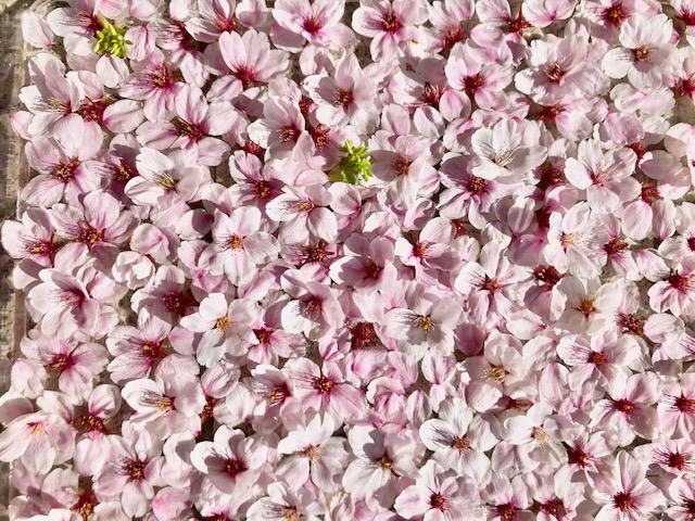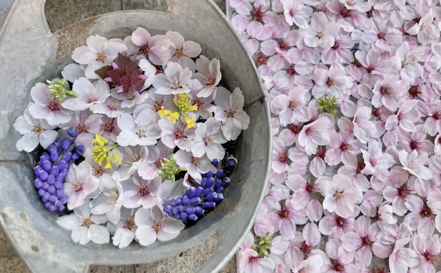せっかくなので、スズメちゃんがおいしくいただいて綺麗に摘んだ桜を私が今度は綺麗に持ち帰って花手水にして家でも桜を楽しんでいます。まだ桜はたくさん咲いています。長持ちするので、スズメに選ばれた可愛い桜たちを見つけたらぜひ試してみてくださいね(^_^)